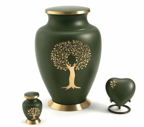 The Aria Urn Series featuring Tree if Life Green colour option displaying a unique tree graphic. Each style is available in three sizes: Large Urn, Keepsake Urn & a Heart Keepsake